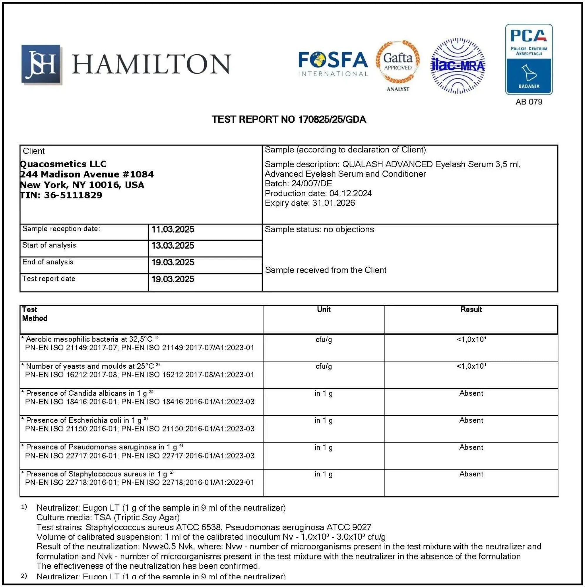 • Independent Laboratory – results verified by J.S. Hamilton.